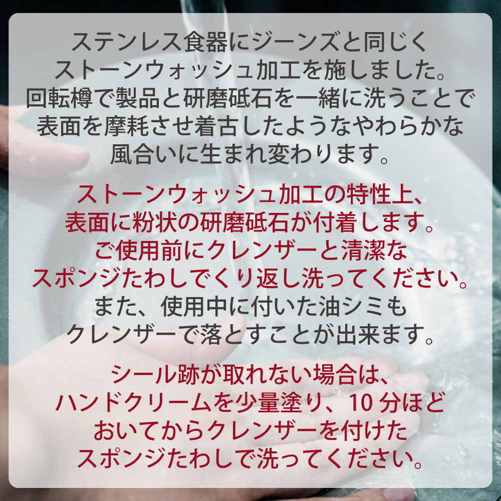 ※ストーンウォッシュ加工の特性上、表面に粉状の研磨砥石が付着します。