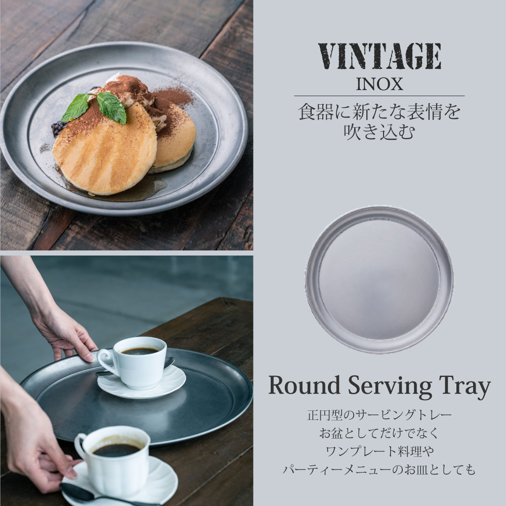 正円型のサービングトレー。しっかりとした作りなので、丸盆としてだけでなく、アウトドアやパーティーでのプレートの用途としても重宝します。
