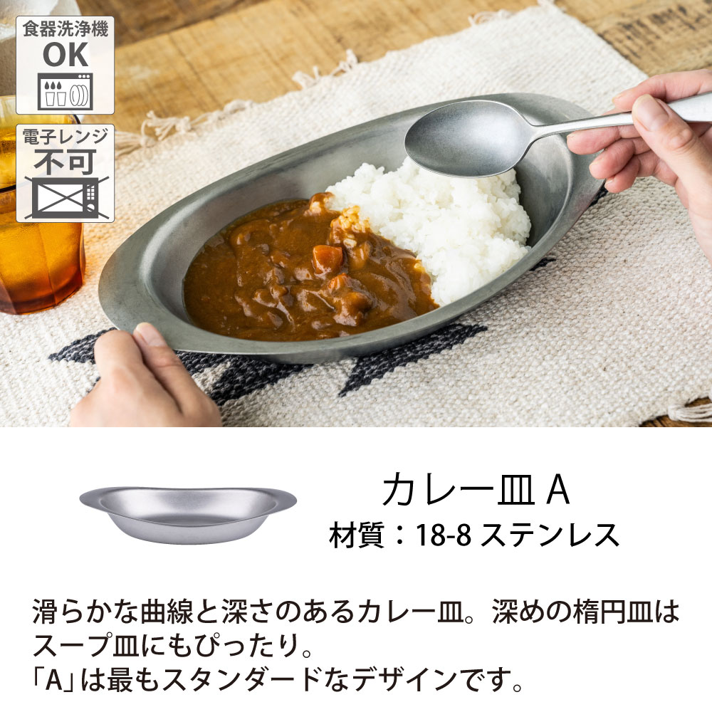 楕円形のなめらかな曲線と深さのあるデザインは盛り付けやすく、カレーのような汁気があるものでもすくいやすいカレープレートです。カレープレートは4種類ご用意。形状やサイズなどお好みのものを選んでください。スタックして収納でき収納場所をとりません。アウトドアでの使用もおすすめ。いつでも上質なものを、永く使いたい方に揃えて頂きたいアイテムです。洗いやすくお手入れも簡単、食器洗浄器にも対応しています。カレー皿Aは一番スタンダードなタイプです。