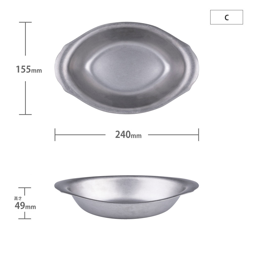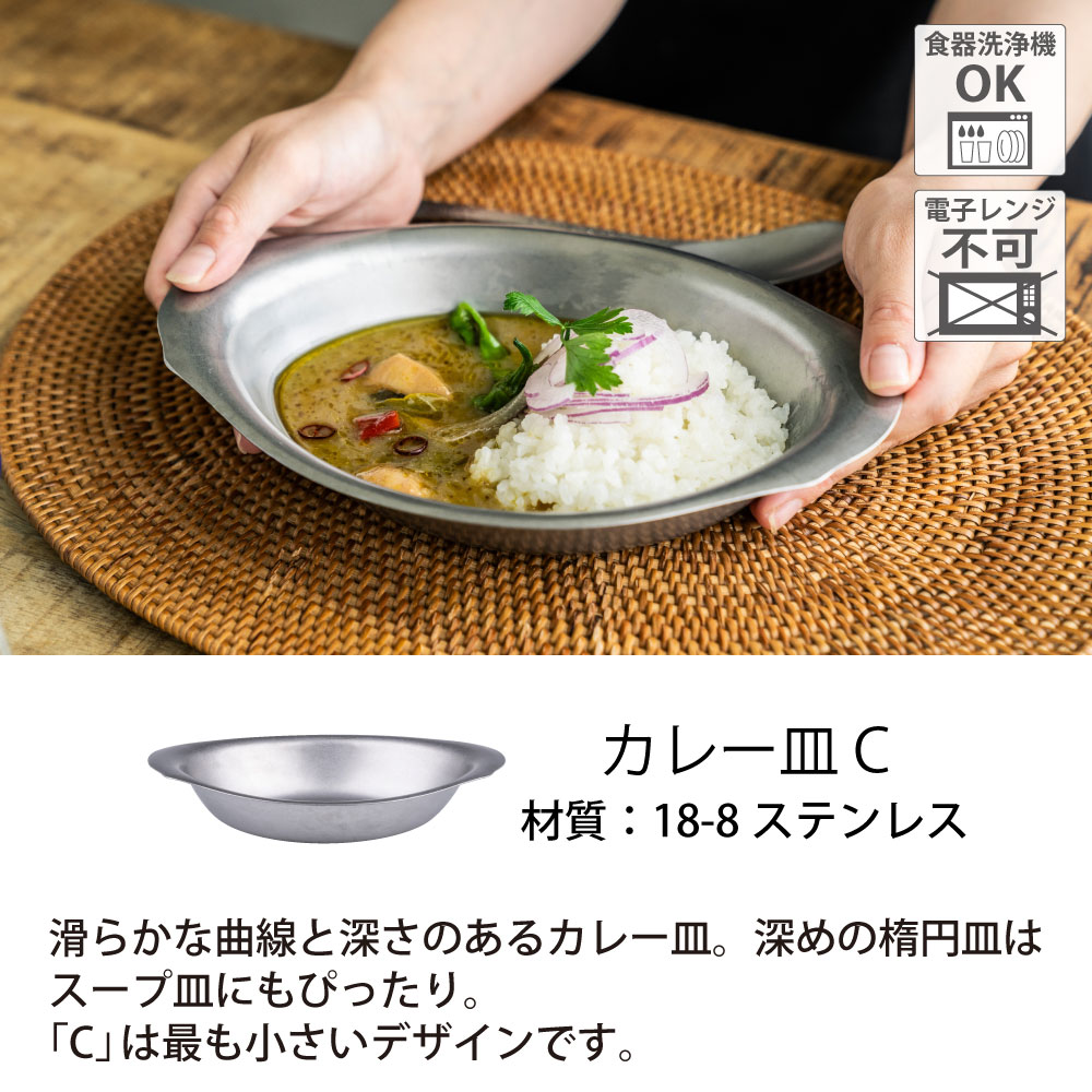 楕円形のなめらかな曲線と深さのあるデザインは盛り付けやすく、カレーのような汁気があるものでもすくいやすいカレープレートです。カレープレートは4種類ご用意。形状やサイズなどお好みのものを選んでください。スタックして収納でき収納場所をとりません。アウトドアでの使用もおすすめ。いつでも上質なものを、永く使いたい方に揃えて頂きたいアイテムです。洗いやすくお手入れも簡単、食器洗浄器にも対応しています。カレー皿Cは4種類の中で一番小さいタイプです。