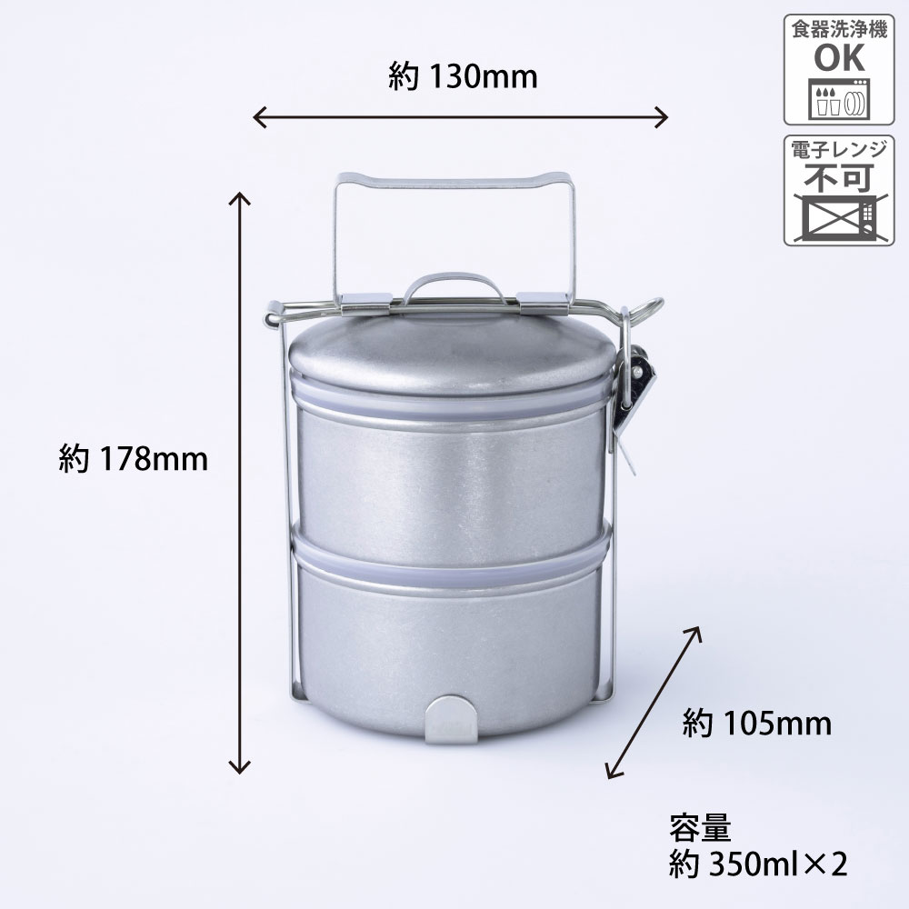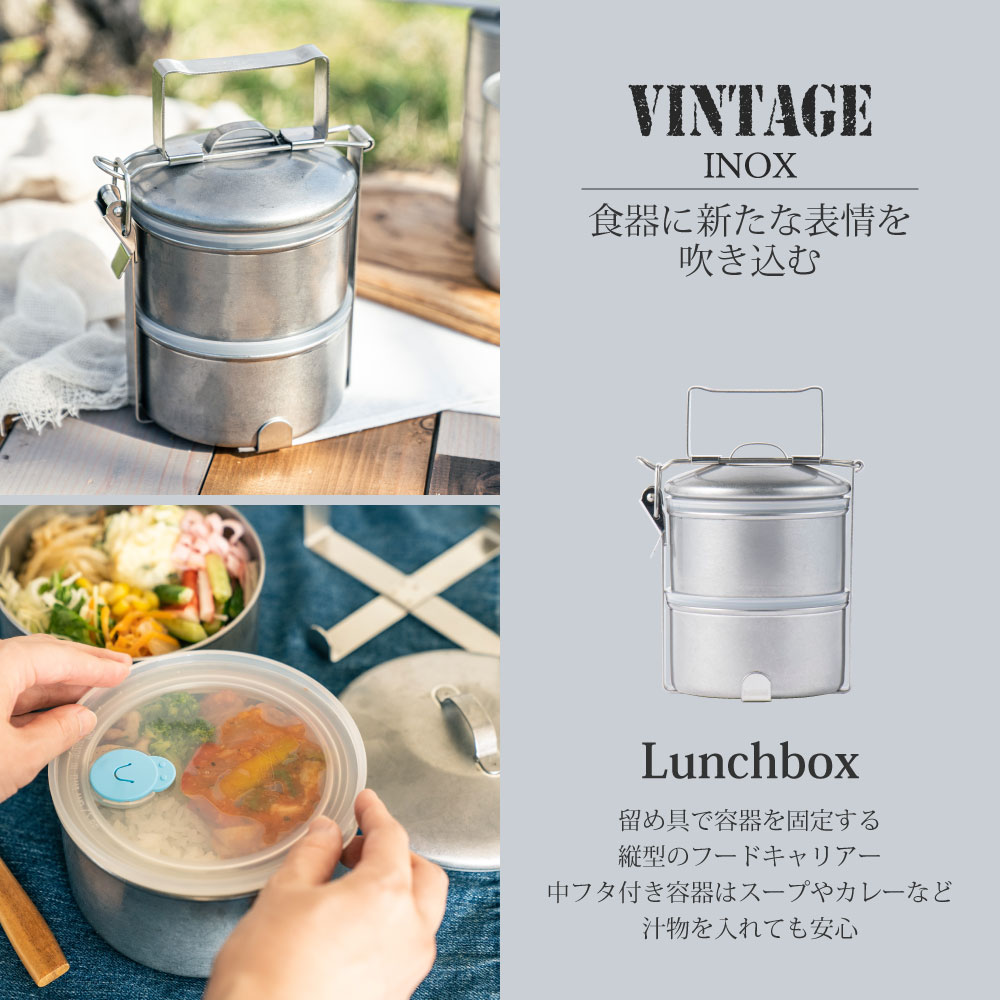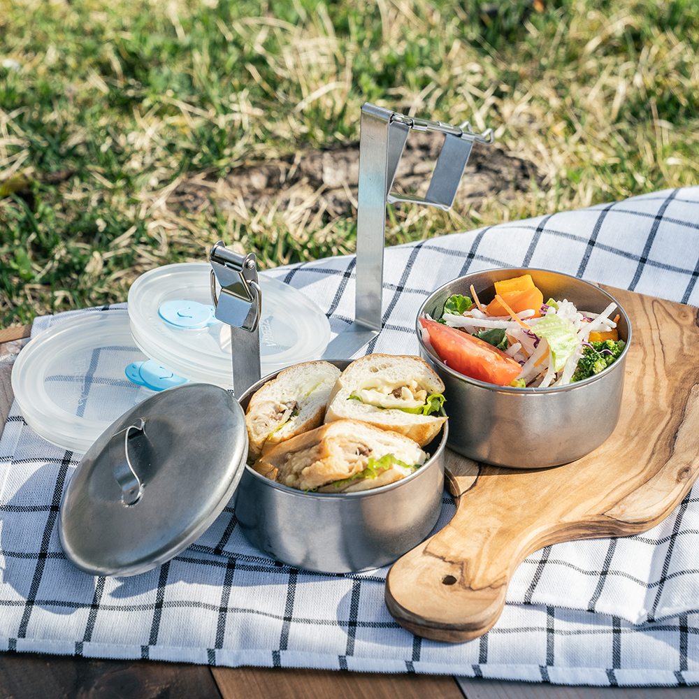 キャンプやアウトドアにおすすめ2段式フードキャリーです。ステンレスは丈夫で油汚れも落としやすく、食材の匂い移りの心配もありません。パッキンがないので洗いやすく衛生的でお手入れが簡単なところも魅力です。中フタ付きなので、スープやカレー、お味噌汁などの汁物も入れられます。ランチボックスや食材のストッカーとしてお使いいただけます。主食×スープを組み合わせることで簡単に栄養のあるお弁当の出来上がり。お弁当作りを気軽にするだけでなく、メニューの幅が広がり飽きずにお弁当を楽しめます。