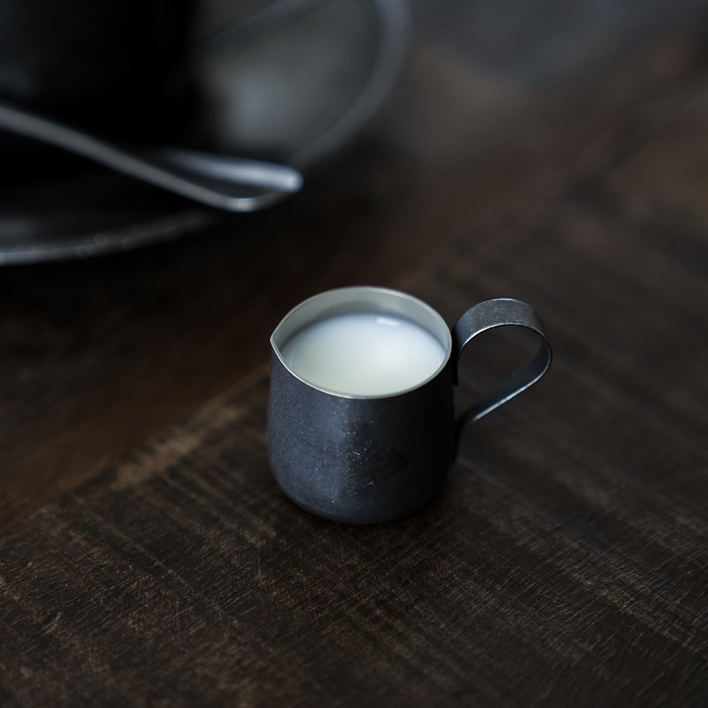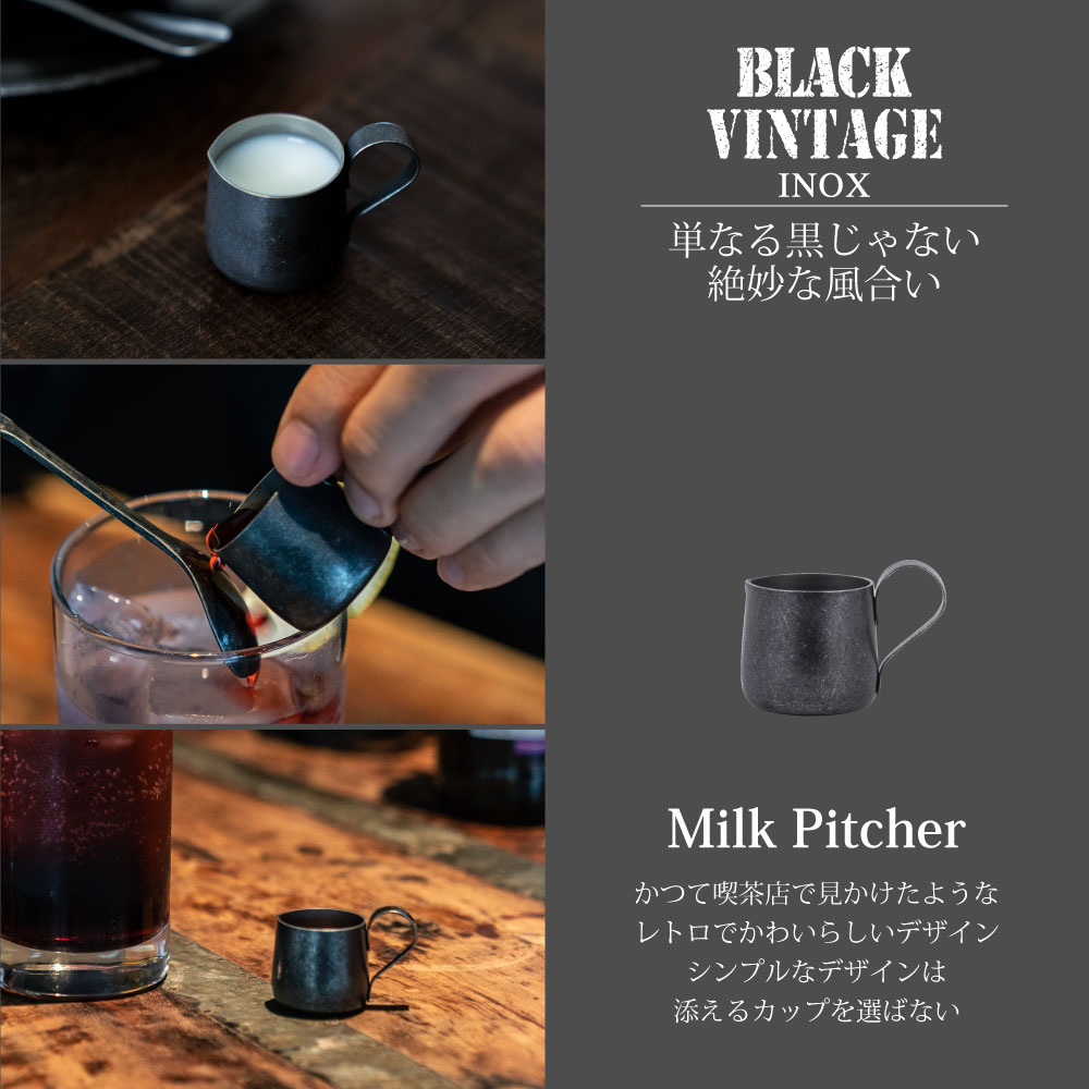 【BLACK VINTAGE INOX】喫茶店で出てきそうな、どこか懐かしさを感じるレトロで愛らしい形状のコーヒー用ミルク入れです。ゆったりとした家でのくつろぎタイムに揃えたいアイテムです。おもてなしや来客時にコーヒーや紅茶にフレッシュミルクを添えてサーブする時も重宝します。フレッシュミルクだけでなくシロップやソースなどを入れて使うのもおすすめです。注ぎ口が上向きになっているデザインで液だれしにくい作りになっています。