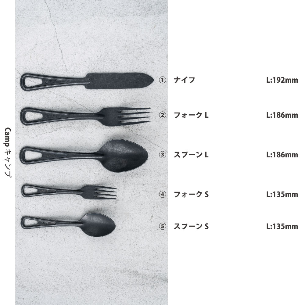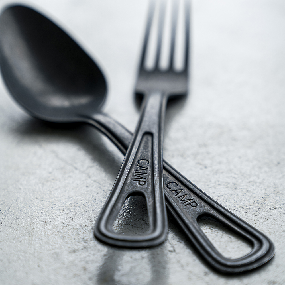 持ち手の部分には”CAMP”と文字が施され武骨なデザインが特徴のカトラリーシリーズ。米軍キャンプで使われいているスプーンやナイフ・フォークをオマージュ。ビンテージなキャンプサイトにぴったり。ミリタリー感あふれる本品は、持ち手の穴の部分に紐を通してセットにしまとめておけるので、アウトドアやキャンプなどにうってつけです。また、インテリアとして壁にかけて見せる収納しても。