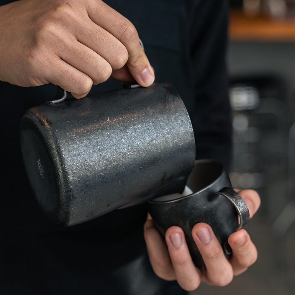 ふわふわのフォームミルクやスチームミルクを作るのに便利なミルクジャグです。細く尖った短い注ぎ口としっかり握り込むことができる大きめハンドルは繊細なアートを描くのにも使いやすくカプチーノやラテアート用としてお使い頂けます。