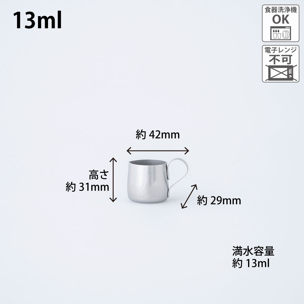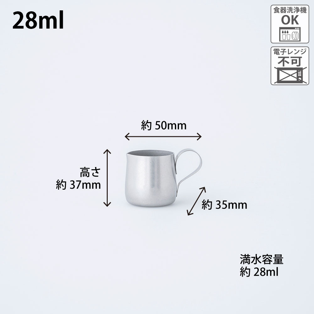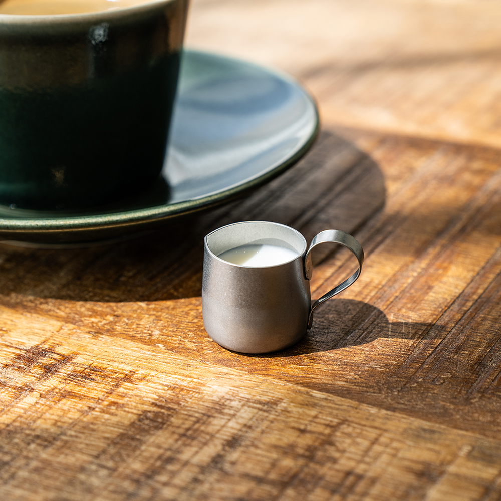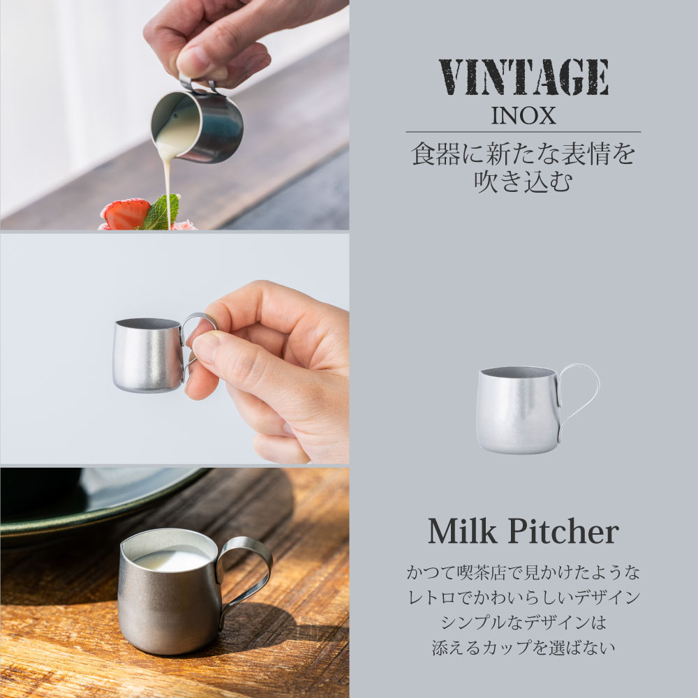 喫茶店で出てきそうな、どこか懐かしさを感じるレトロで愛らしい形状のコーヒー用ミルク入れです。ステンレスにヴィンテージ加工を施した独特な味わいはインダストリアルな雰囲気漂い、渋く格好いい。気取らずシンプル、それでいてスタイリッシュに空間を演出し優雅なコーヒータイムを演出します。使い込むほどにいろんな表情を見せ経年変化を楽しめるのも魅力のひとつ。おもてなしや来客時にコーヒーや紅茶にフレッシュミルクを添えてサーブする時も重宝します。フレッシュミルクだけでなくシロップやソースなどを入れて使うのもおすすめです。注ぎ口が上向きになっているデザインで液だれしにくい作りになっています。